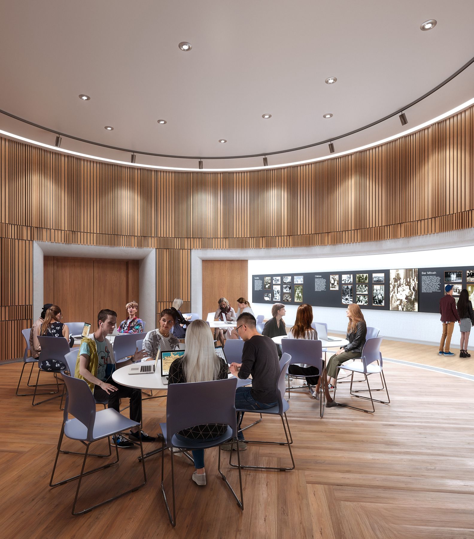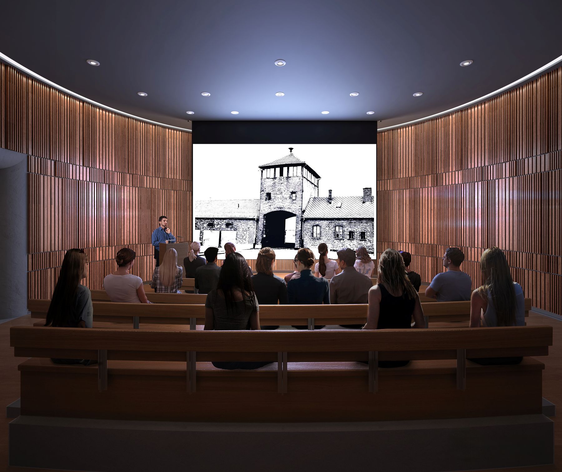 Im Inneren unterstreicht die Materialauswahl den feierlichen und zugleich aufbauenden Charakter der Gedenkstätte: Geschliffene Steinböden, holzverkleidete Wandpaneele und sanft gestreutes Licht schaffen eine Atmosphäre, die zum Nachdenken einlädt, während akustische Holzpaneele, dunkle Theaterverkleidungen und Akzente aus poliertem Metall die Exponate einrahmen. Die Besucher erleben eine weitläufige Ausstellungsgalerie mit 11 permanenten Tafeln, die den historischen Verlauf des Holocaust nachzeichnen und mit Familienfotos von Überlebenden aus der Region verwoben sind, sowie digitale Tafeln, die den Anstieg des weltweiten Antisemitismus dokumentieren. Das Herzstück bilden zwei hochmoderne Kinosäle, in denen das Programm „Dimensions in Testimony“ der USC Shoah Foundation gezeigt wird, das in Echtzeit simulierte Gespräche mit Überlebenden ermöglicht. Das Gebäude bietet zudem einen einladenden Empfangsbereich, Mehrzweckräume für Schülergruppen und Lehrerfortbildungen, flexible Räume für Virtual-Reality-Programme und Vorträge sowie ruhige Bereiche zum Nachdenken.