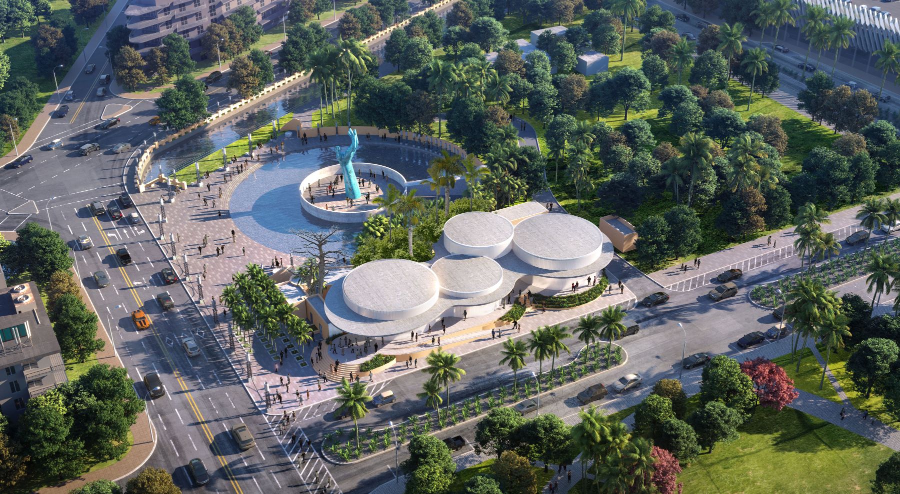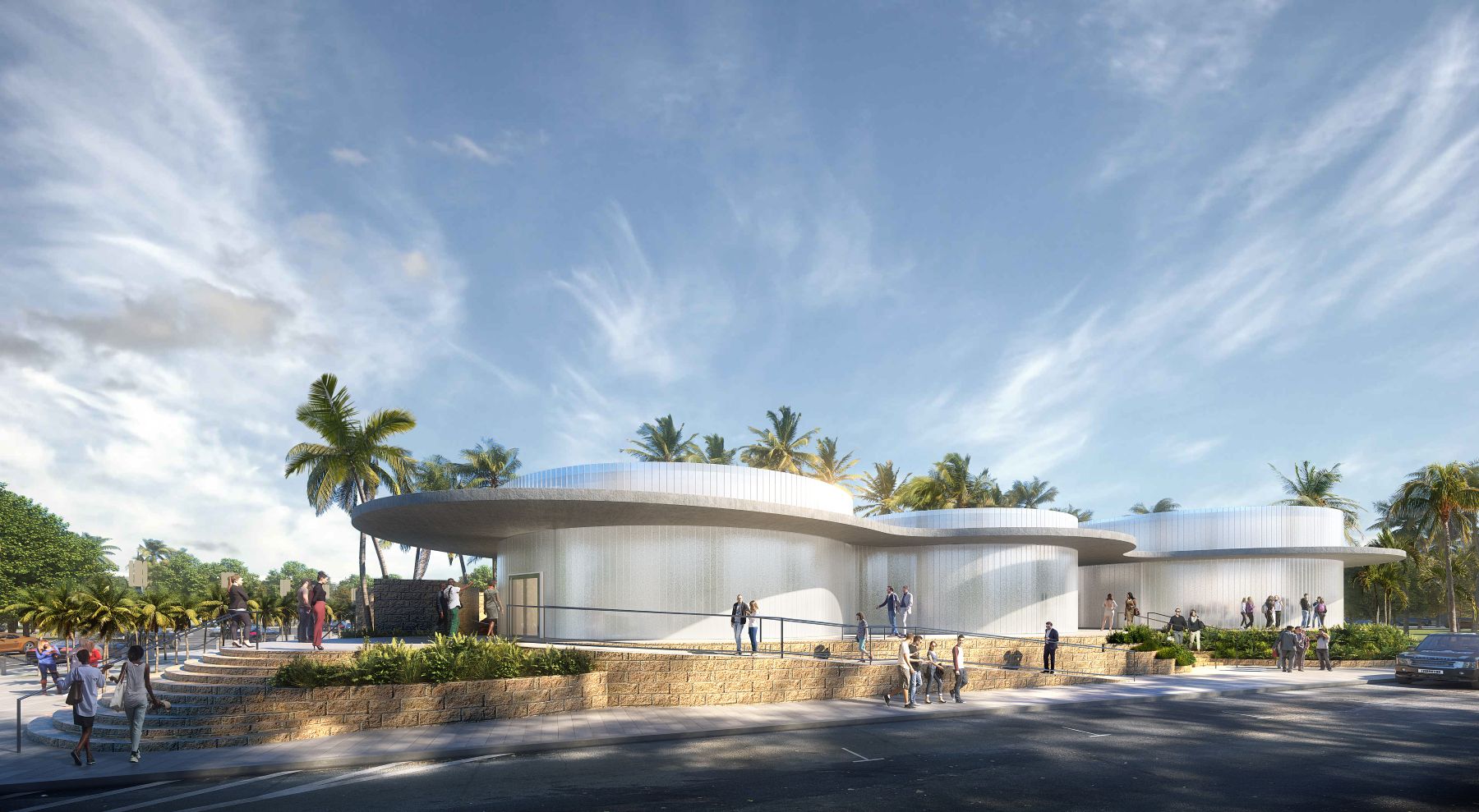 Das neue „Holocaust Memorial Miami Beach Education Center“, das im März 2026 an der südwestlichen Ecke des Memorial-Campus in der Meridian Avenue 1933–1945 eröffnet wurde, läutet ein wegweisendes neues Kapitel in der Holocaust-Gedenkarbeit ein. Das Gebäude wurde als einstöckiger, zurückhaltender Bau entworfen und fügt sich bewusst in Kenneth Treisters ursprüngliches Denkmal aus dem Jahr 1990 ein, um den ikonischen, vier Stockwerke hohen, ausgestreckten Bronzearm und den ihn umgebenden Spiegelteich, die Gedenkgärten sowie Hunderte von Bronzefiguren nicht zu überlagern. Sensibel inmitten einer gewachsenen Landschaft direkt gegenüber dem Teich gelegen, ergänzt die Farbpalette des Zentrums den rosafarbenen Jerusalem-Stein und die Bronze des Originals durch warme, zeitgenössische Materialien und großzügige Verglasungen, die einen kontemplativen Blick zurück auf die Skulptur ermöglichen.