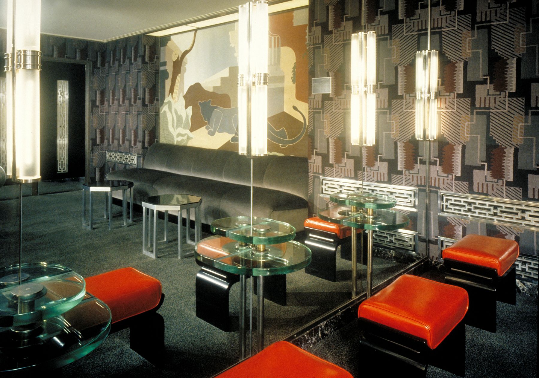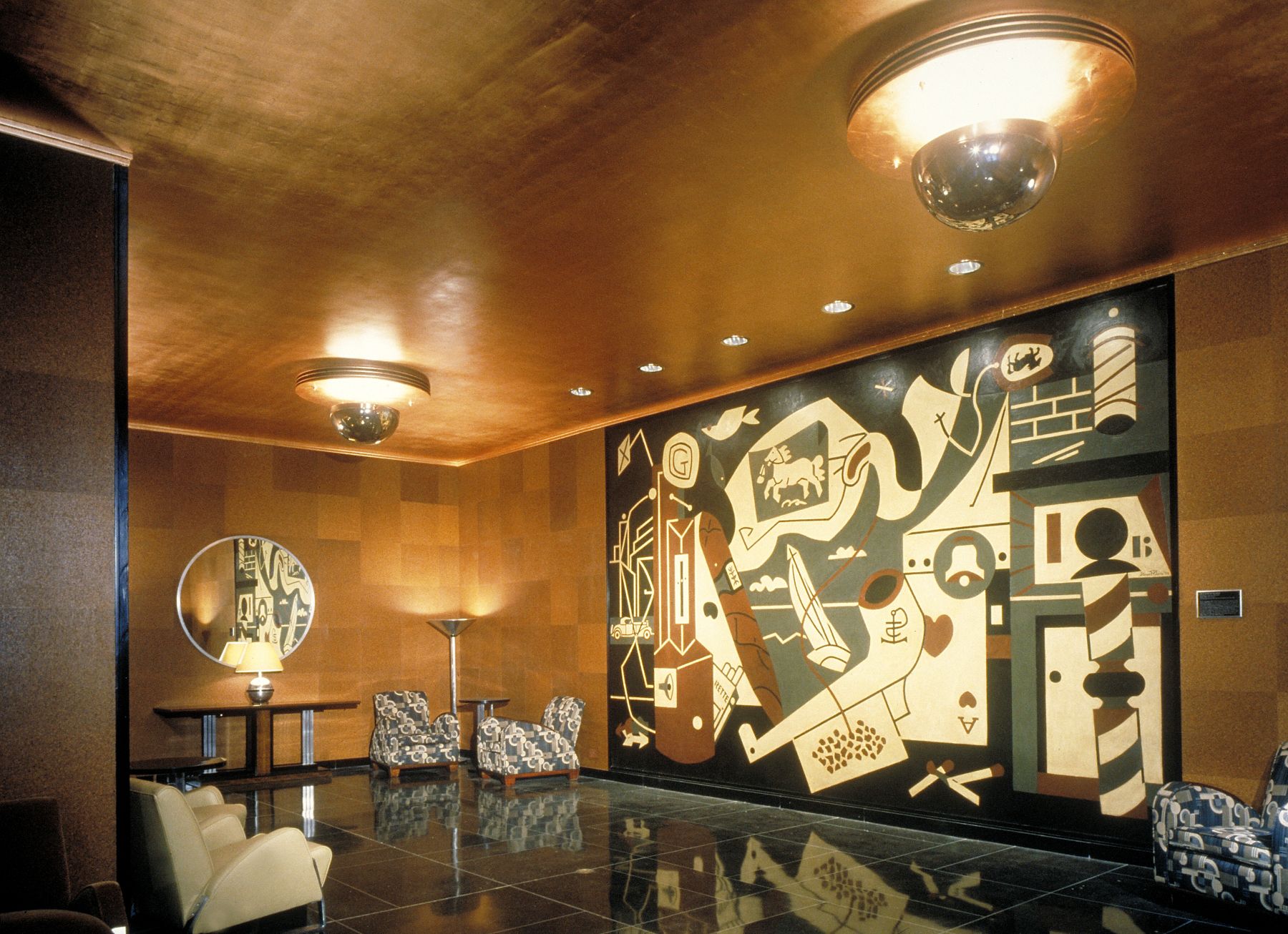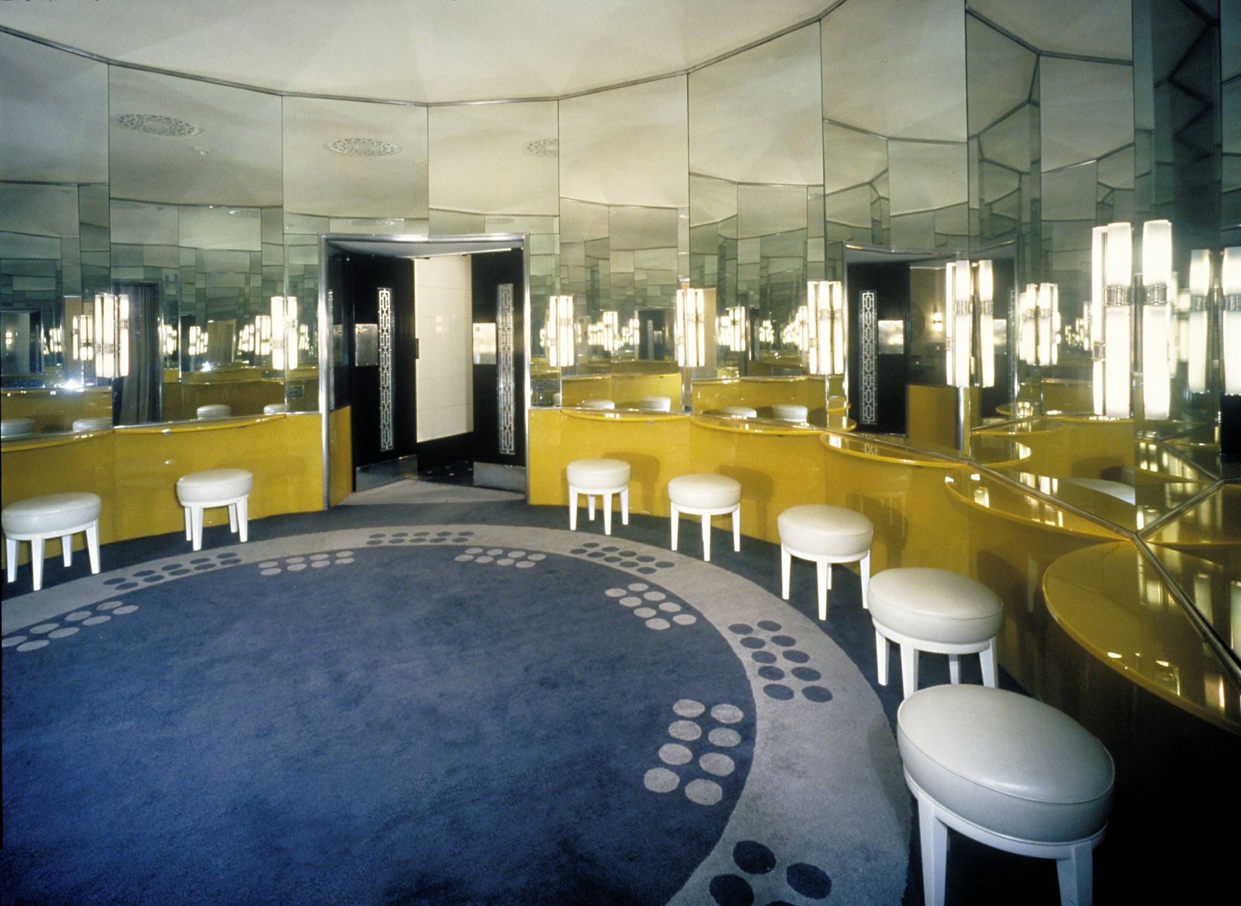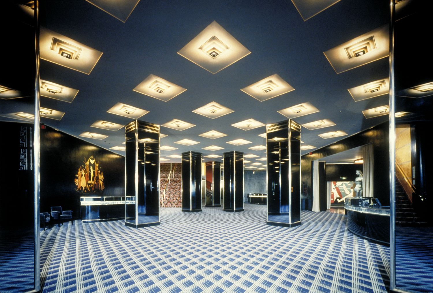 地毯、墙面装饰与软装面料均恢复了早期的大胆图案与质感,壁画也重现了昔日的绚丽光彩。原装的唐纳德·德斯基家具与灯具经过翻新修复。众多外部设计元素得以复原,令建筑的夜间景观更显恢弘。招牌照明恢复为红蓝霓虹灯管搭配金色字体的经典设计,这种效果自1930年代后便未曾再现。