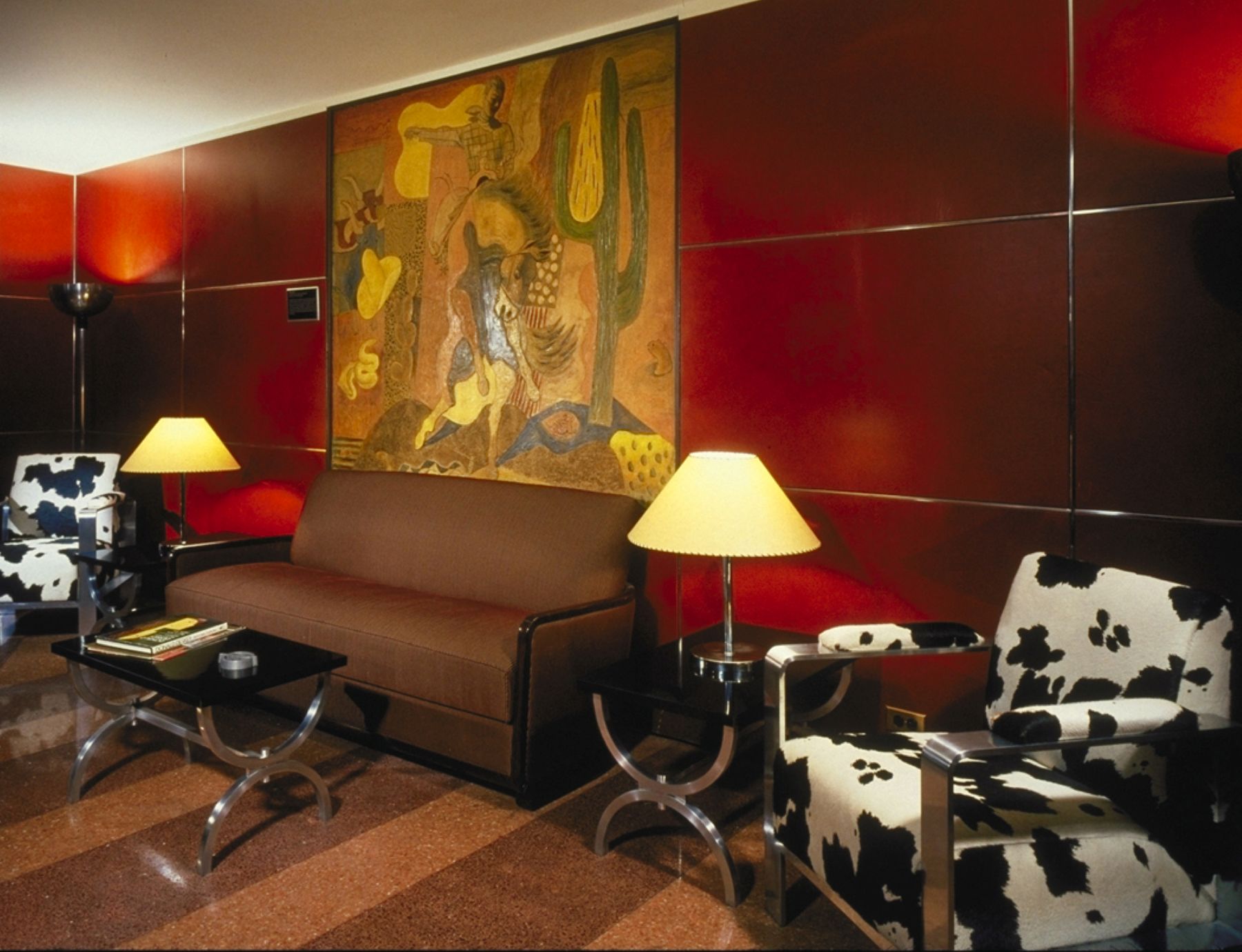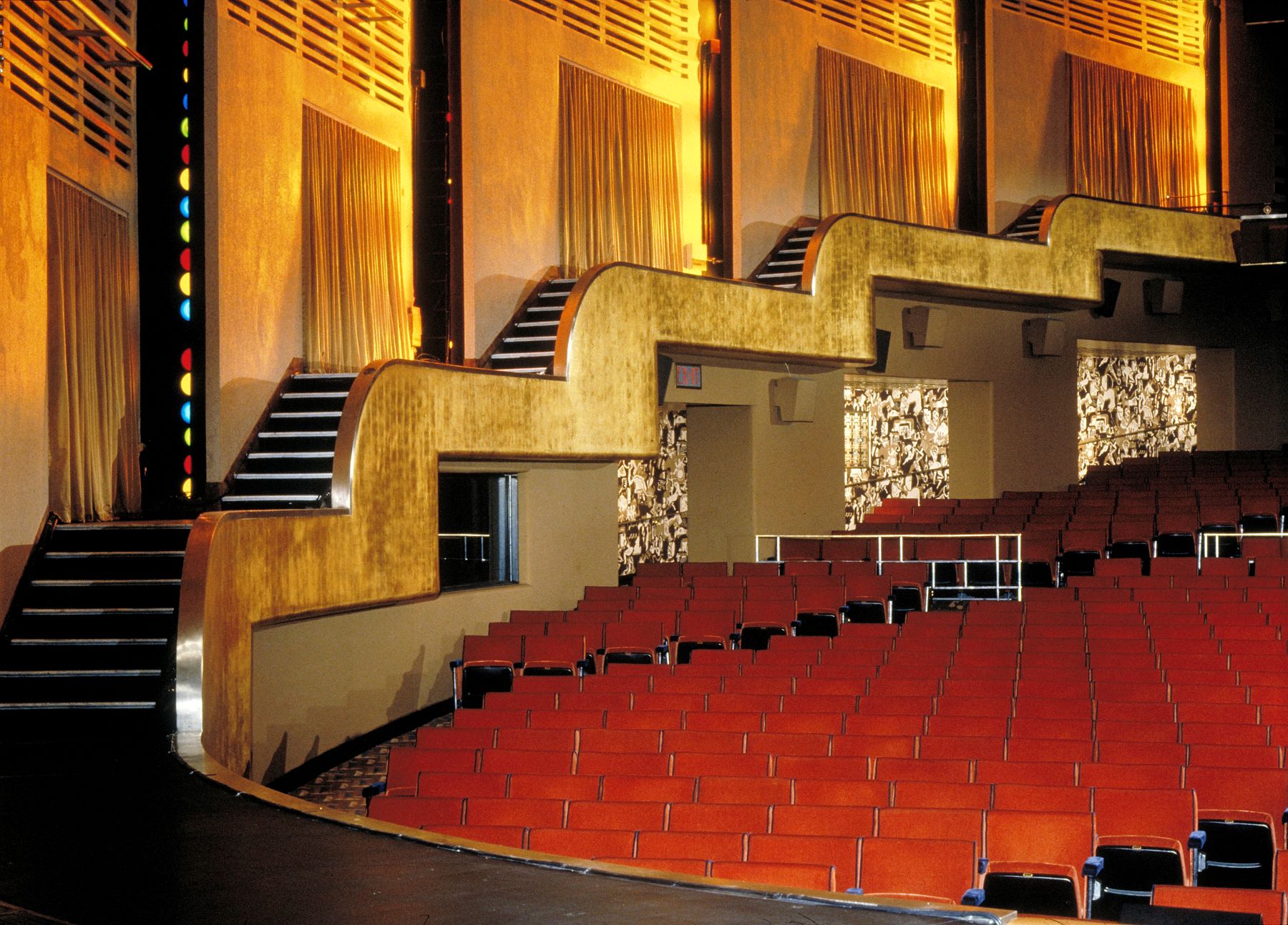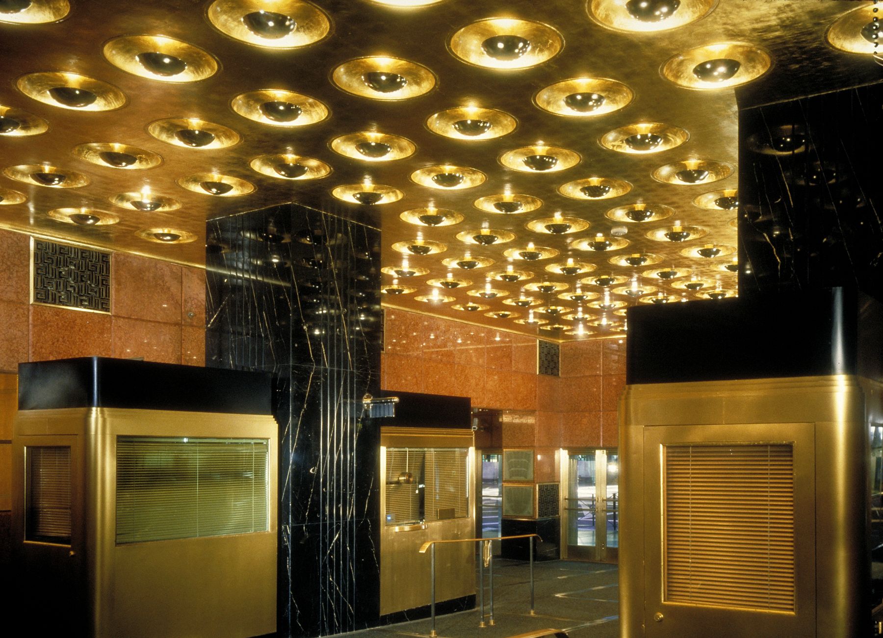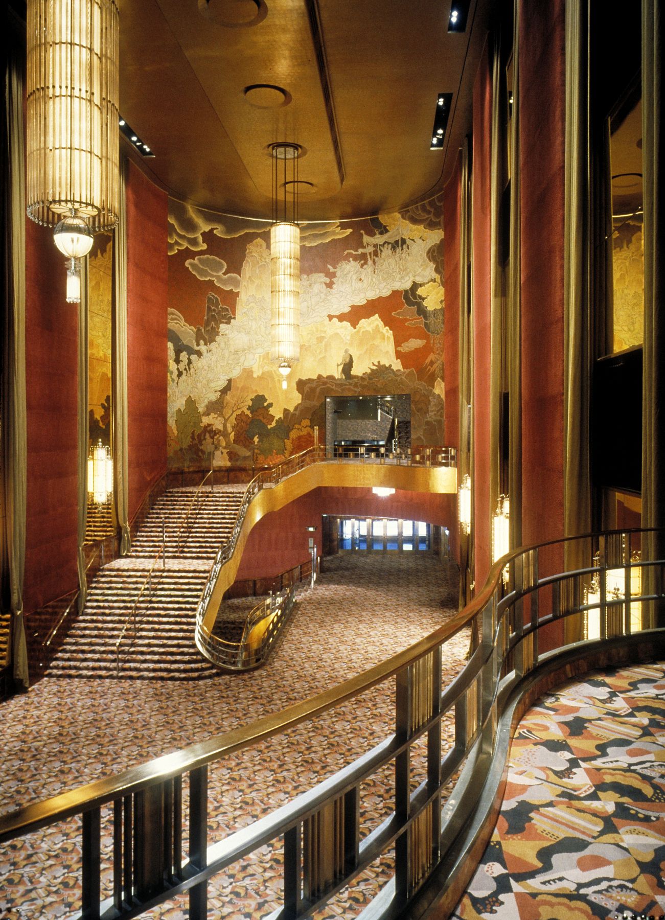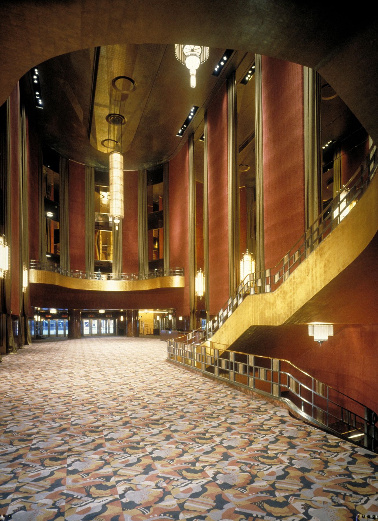 地毯、墙面装饰与软装面料均恢复了早期的大胆图案与质感,壁画也重现了昔日的绚丽光彩。原装的唐纳德·德斯基家具与灯具经过翻新修复。众多外部设计元素得以复原,令建筑的夜间景观更显恢弘。招牌照明恢复为红蓝霓虹灯管搭配金色字体的经典设计,这种效果自1930年代后便未曾再现。